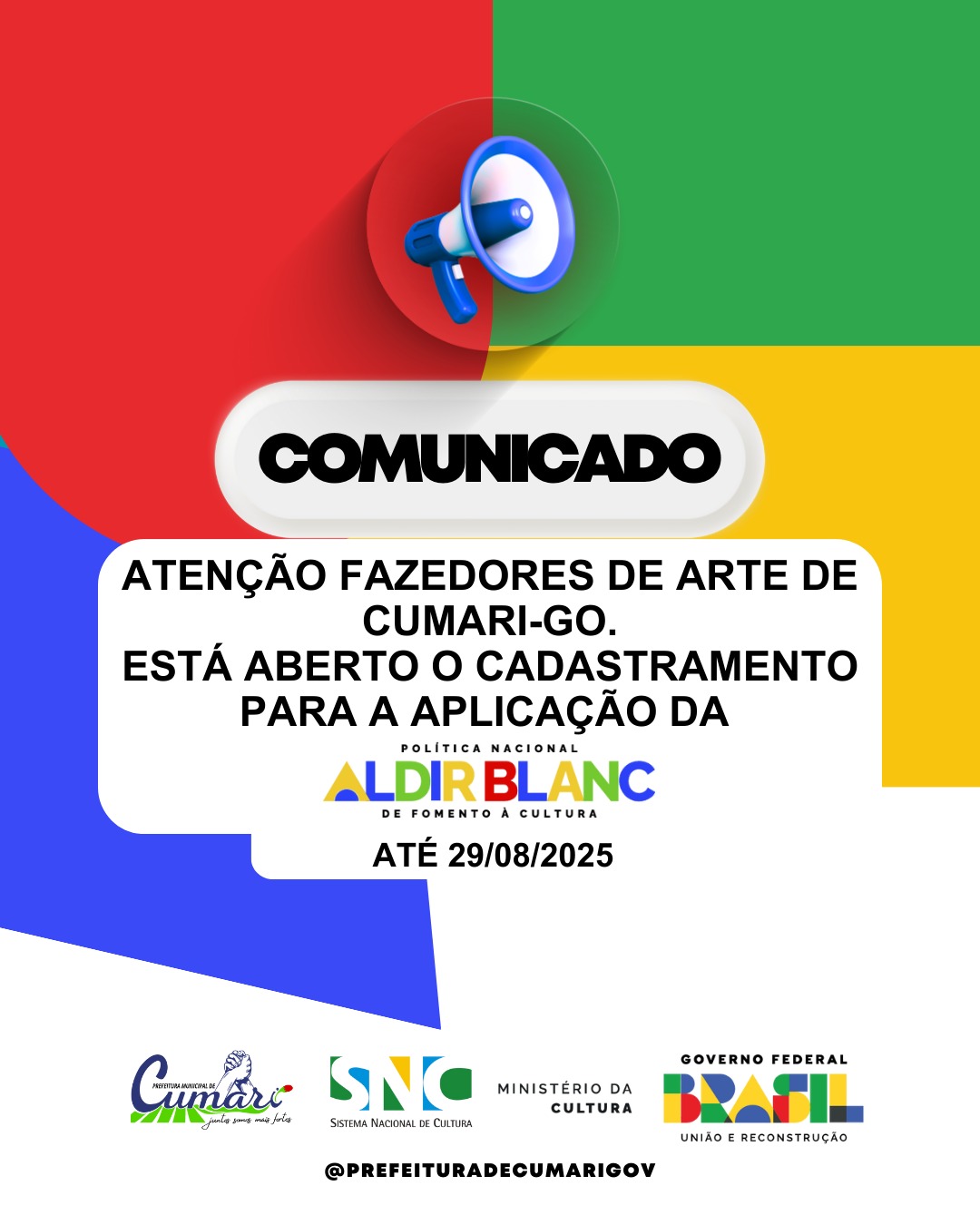A PREFEITURA MUNICIPAL DE CUMARI, ABRE CADASTRAMENTO PARA AGENTES CULTURAIS E ESPAÇOS DE CULTURA REFERENTE A APLICAÇÃO DA POLÍTICA NACIONAL ALDIR BLANC DE FOMENTO À CULTURA.