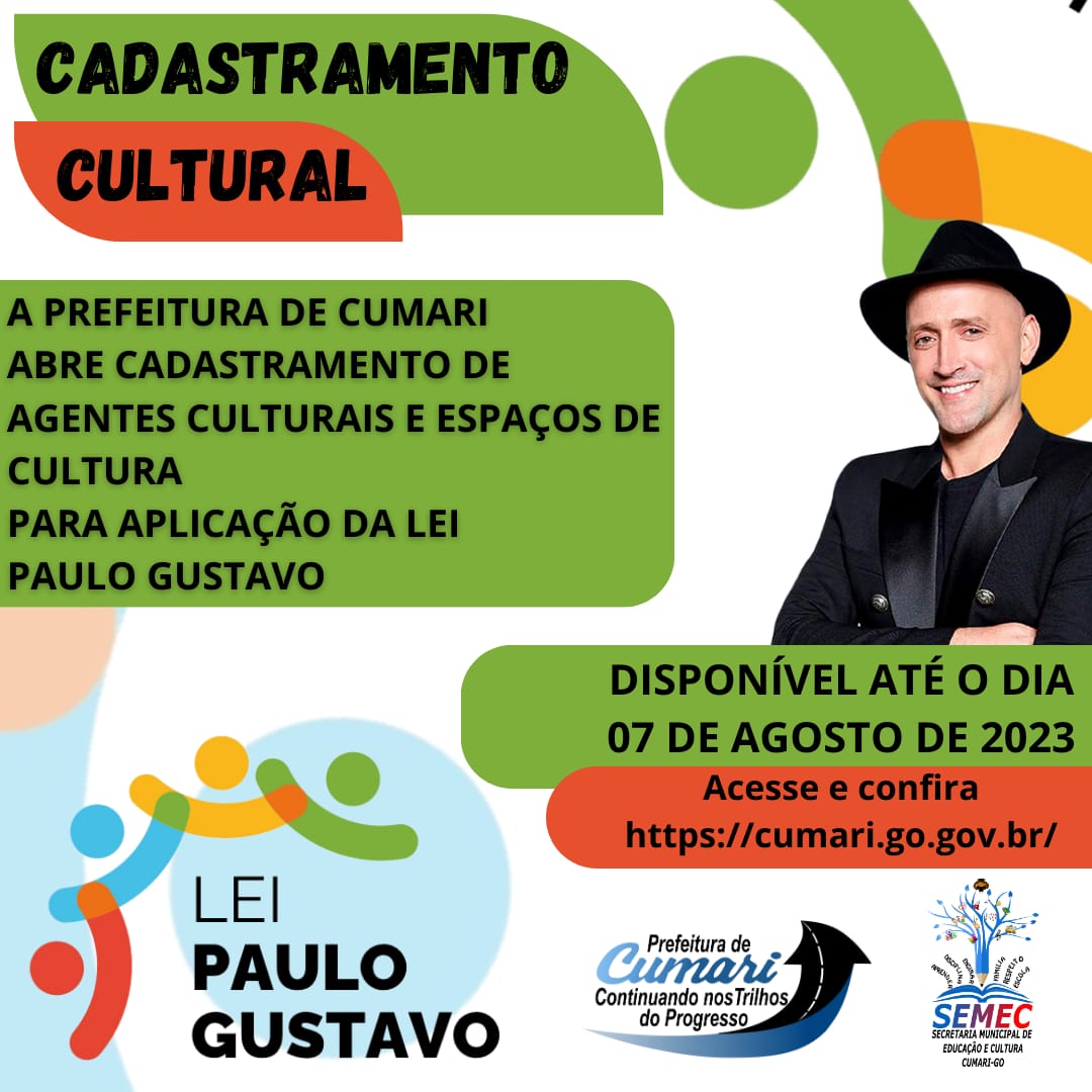 Link para realizar o cadastro:  A PREFEITURA MUNICIPAL DE CUMARI, ABRE CADASTRAMENTO PARA AGENTES CULTURAIS E ESPAÇOS DE CULTURA REFERENTE A APLICAÇÃO DA LEI PAULO GUSTAVO. (google.com)